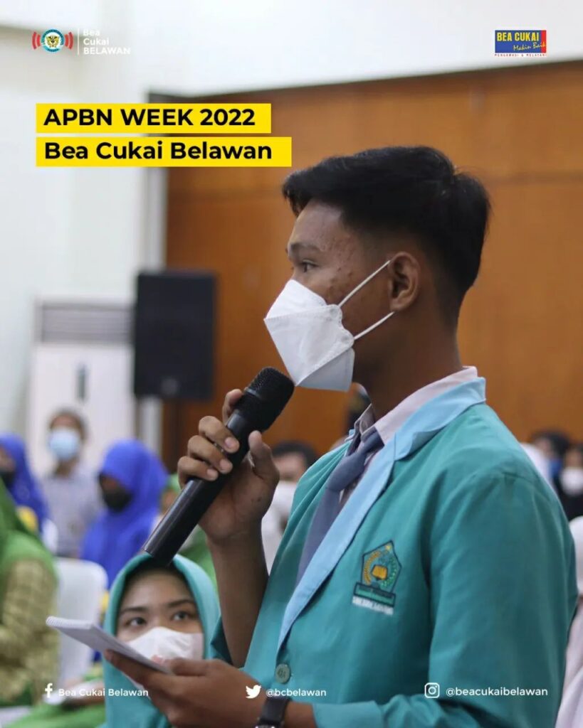 APBN Week 2022 adalah event yang diselenggarakan oleh Direktorat Jenderal Bea dan Cukai secara serentak di seluruh wilayah Indonesia pada 21-25 Februari 2022, menyasar kalangan pelajar dan mahasiswa dengan tujuan memberikan pemahaman terkait Pengelolaan Keuangan Negara, APBN dan juga peran Bea Cukai didalamnya.