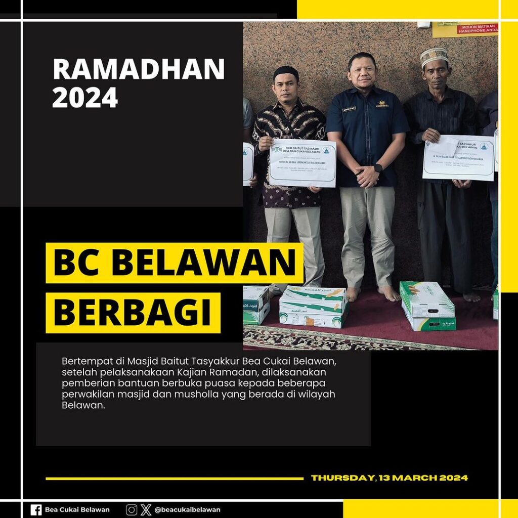 Bea Cukai Belawan Berbagi ke Masyarakat BELAWAN (13/03/2024) – Di sepanjang Ramadan 1445 H, Panitia Ramadan Bea Cukai Belawan telah mempersiapkan beberapa program-program dalam meningkatkan mental dan spiritual pegawai serta kegiatan sosial lainnya yang menyasar masyarakat sekitar. Bertempat di Masjid Baitut Tasyakkur Bea Cukai Belawan, setelah pelaksanaan Kajian Ramadan, dilakukan pemberian bantuan berbuka puasa kepada …