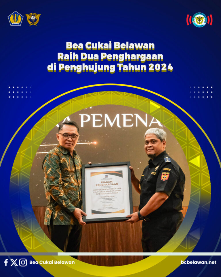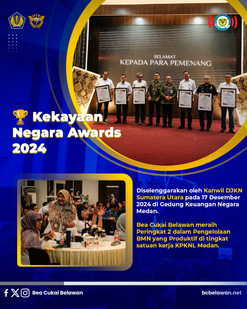 Medan (17/12/2024) – Menutup tahun 2024 dengan prestasi, Bea Cukai Belawan berhasil meraih dua penghargaan bergengsi dari dua institusi berbeda. Penghargaan pertama diberikan oleh Kantor Wilayah Direktorat Jenderal Kekayaan Negara (DJKN) pada acara Kekayaan Negara Awards 2024 yang digelar di Aula Rekreasi Gedung Keuangan Negara Medan, Selasa, 17 Desember 2024.