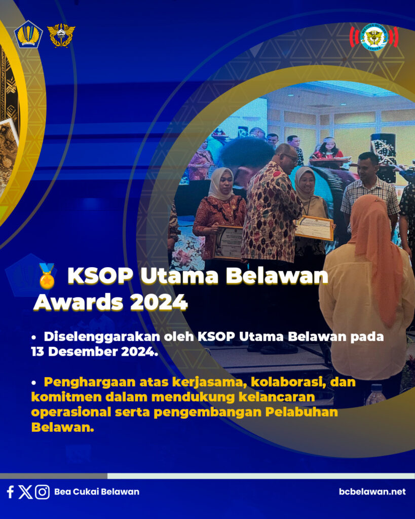 Penghargaan berikutnya datang dari Kantor Kesyahbandaran dan Otoritas Pelabuhan (KSOP) Utama Belawan dalam acara KSOP Utama Belawan Awards 2024 yang digelar pada 13 Desember 2024. Penghargaan ini diberikan atas kerjasama, kolaborasi, dan komitmen Bea Cukai Belawan dalam mendukung kelancaran operasional serta pengembangan ekosistem logistik di Pelabuhan Belawan.