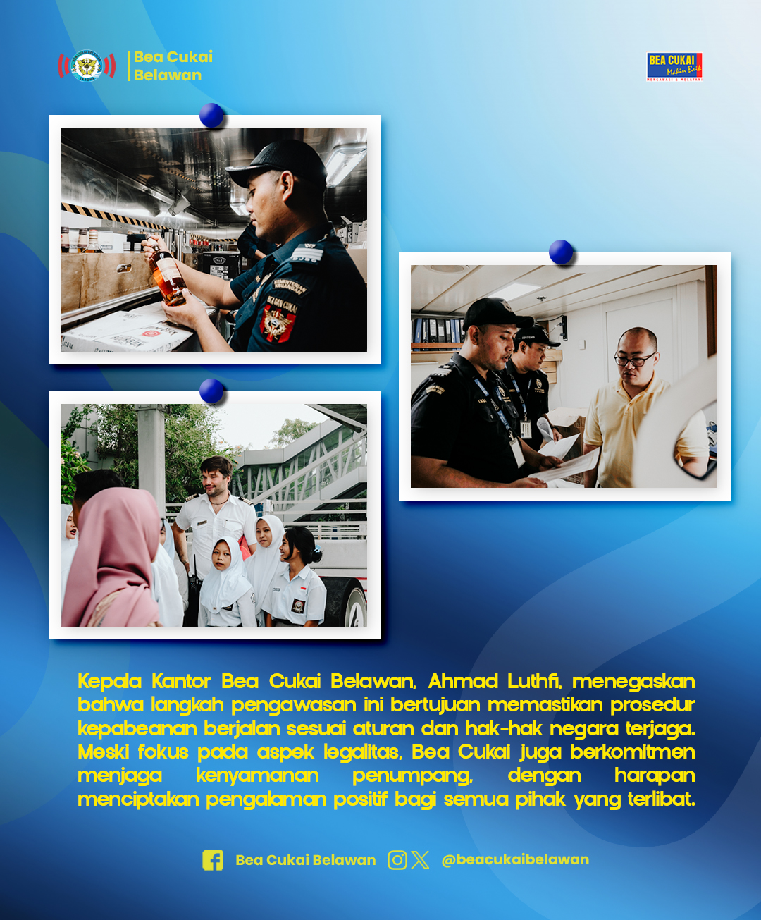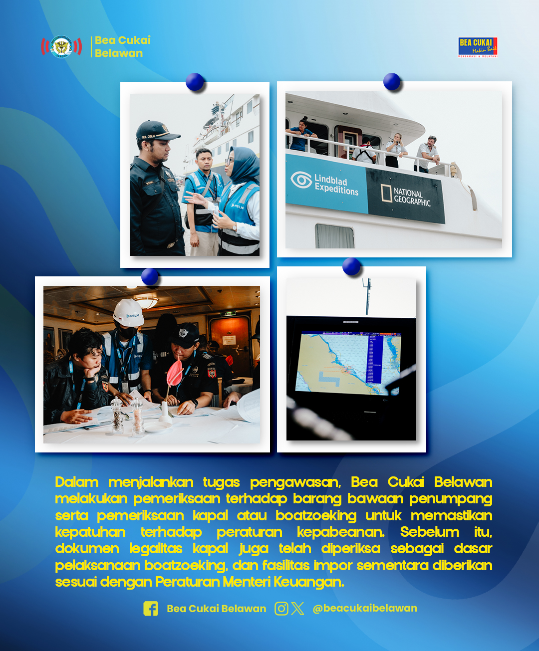 Bea Cukai Belawan menyambut kedatangan MV National Geographic Orion yang singgah di Sumatera Utara. Dengan penuh komitmen, Bea Cukai Belawan memastikan kelancaran dan kenyamanan setiap penumpang melalui pengawasan yang ketat namun efisien. Legalitas terjamin, kenyamanan tetap diutamakan! 🌊⚓