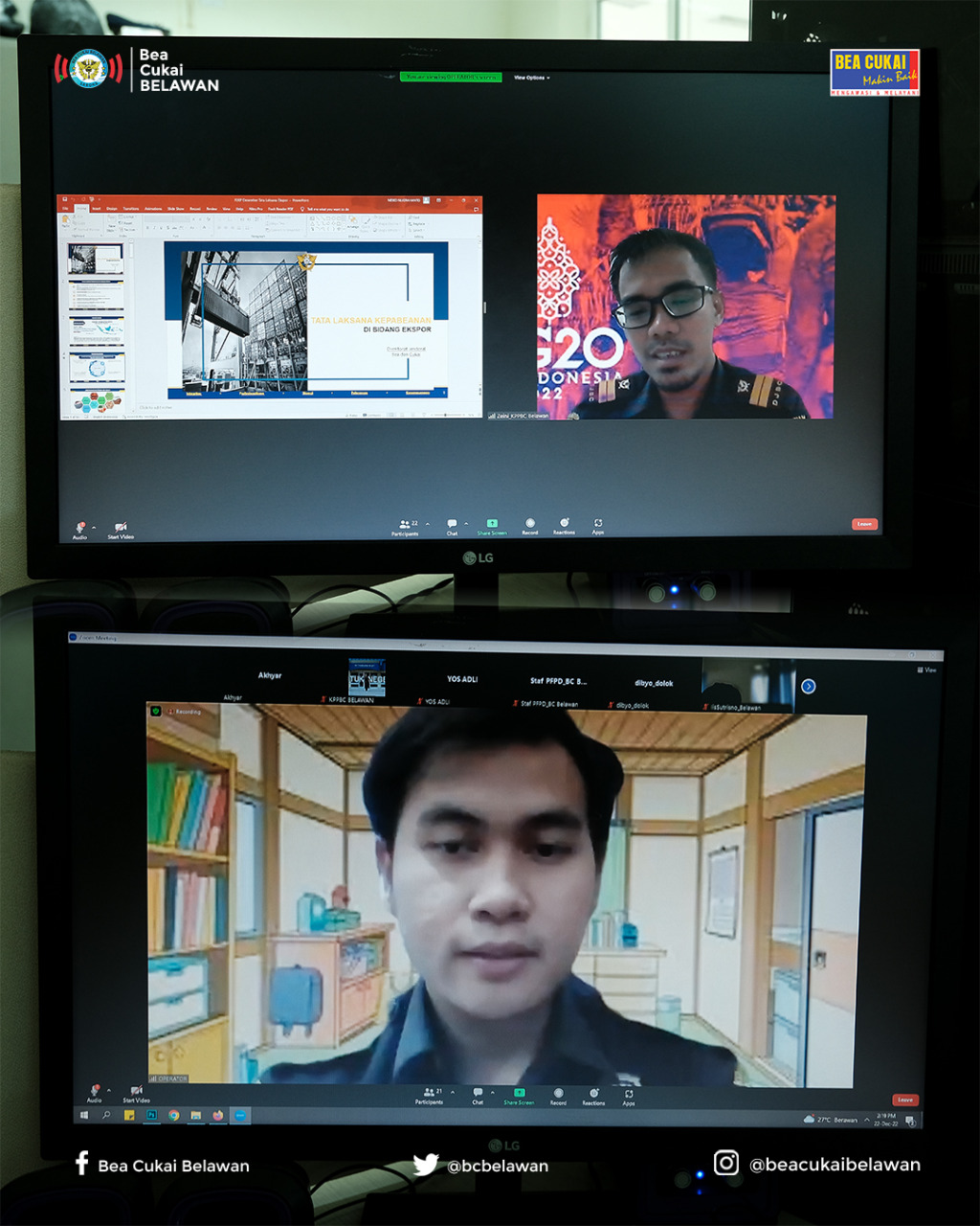 Belawan (22/12), tingkatkan pemahaman para pegawai Bea Cukai Belawan di bidang Kepabeanan dan Cukai, dilaksanakan kegiatan P2KP tentang Pemeriksaan Barang Ekspor dan Pemutusan Dokumen Ekspor secara daring via zoom. Kegiatan diikuti oleh sejumlah Pemeriksa Barang Ekspor dan pegawai pada unit lainnya.
