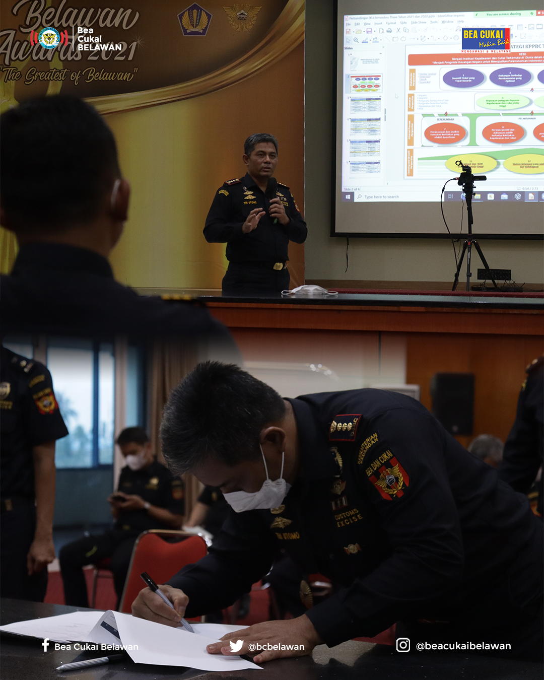 Belawan, (31/1) Bertempat di Aula Deli, Bea Cukai Belawan laksanakan penandatangan Kontrak Kinerja tahun 2022. Kegiatan ini dilaksanakan secara tatap muka terbatas yang dihadiri secara langsung oleh seluruh Kepala Seksi, perwakilan Pejabat Fungsional dan Pelaksana, selebihnya melalui zoom online meeting.